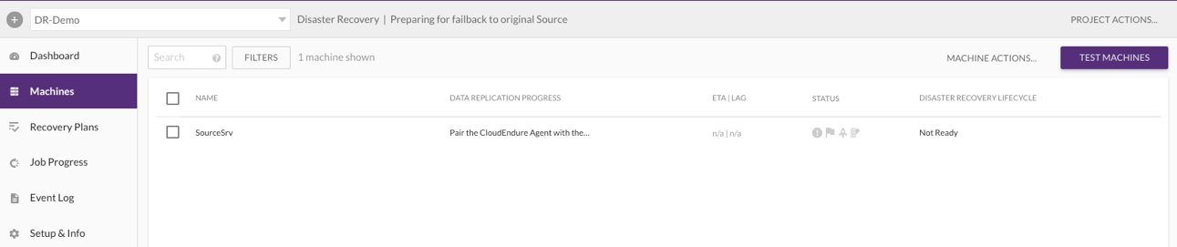 El proyecto mostrará “Preparing for failback to original Source” junto al tipo de proyecto. Después de unos minutos, la columna Data Replication Progress mostrará “Pair the CloudEndure Agent with the Replication Server”. Este estado solo cambiará después de completar la instalación del cliente de failback en Azure en el paso siguiente.