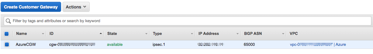 e. Crear un Customer Gateway (CGW). Seleccione Estático para enrutamiento y proporcione la dirección IP pública para la Virtual Private Gateway de Azure que se indica en el paso (a-b). En Dirección IP estática, escriba la dirección de red del sitio primario en Azure.