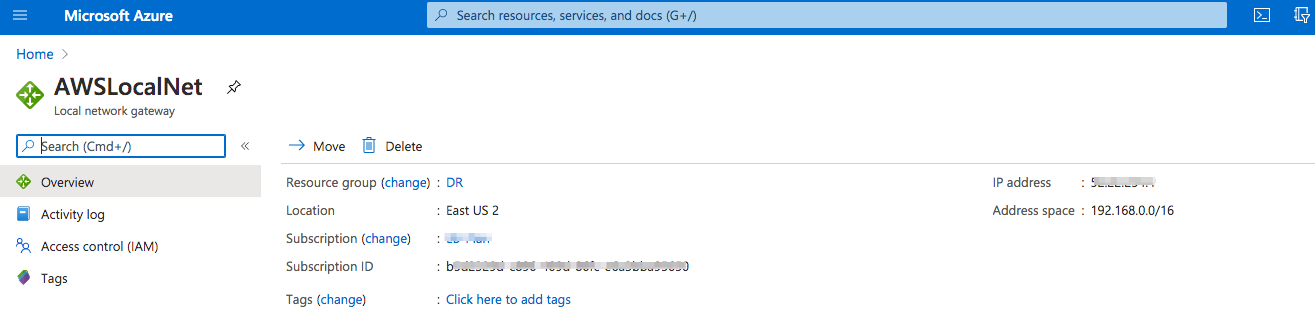 i. Cree un Local Network Gateway. Proporcione la dirección IP externa indicada en el paso (h). En el campo Address space (Espacio de direcciones), proporcione la dirección de red de la VPC de DR del lado de AWS.