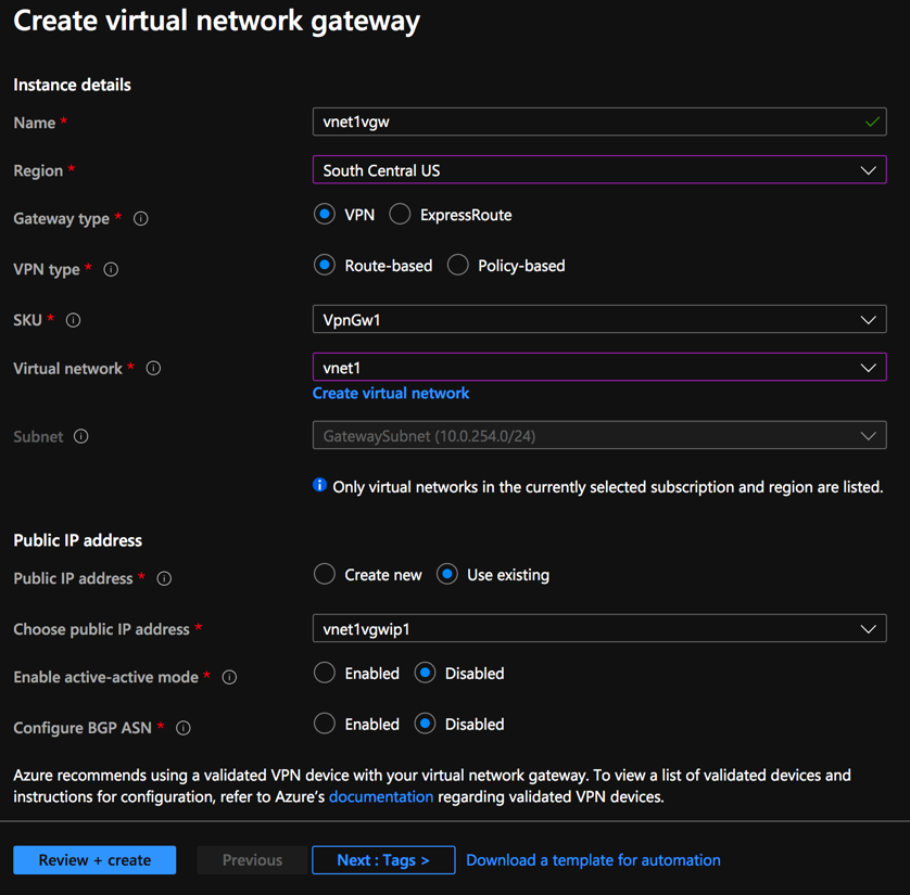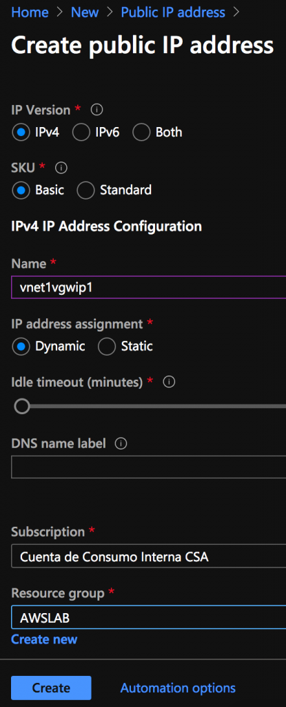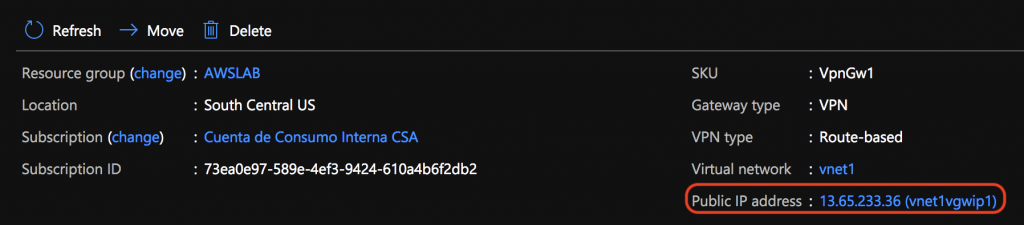 - Tome nota de la dirección IP publica del Virtual Network Gateway de Azure