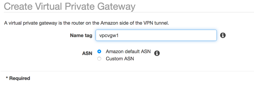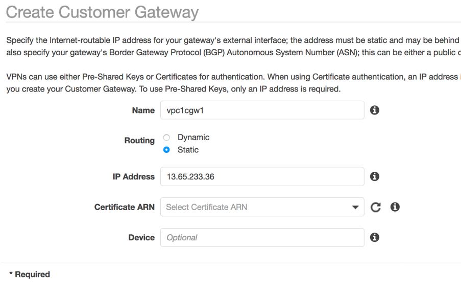 - Para la dirección IP, ponga la dirección IP identificada en el paso anterior (Virtual Private Gateway).