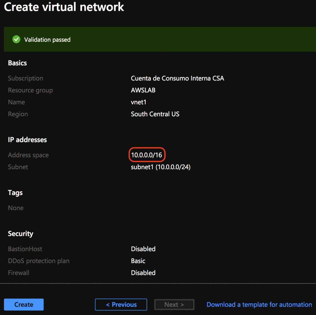 - Para fines de este post vamos a crear el segmento de red 10.0.0.0/16 en Azure.