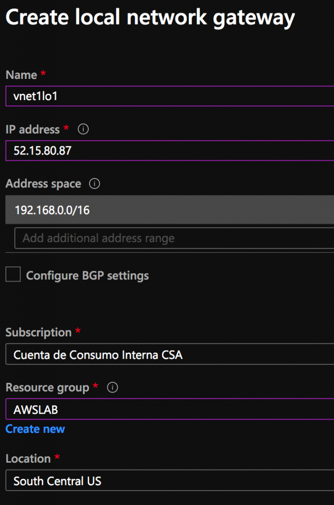 - Configure el segundo Local Network Gateway (Repetir paso No. 12).