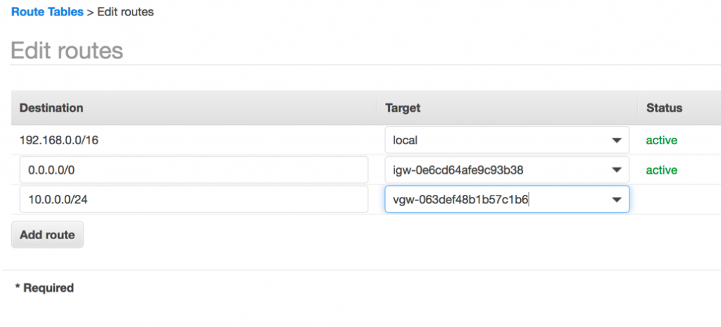 14. Agregue el Virtual Private Gateway a la tabla de ruteo