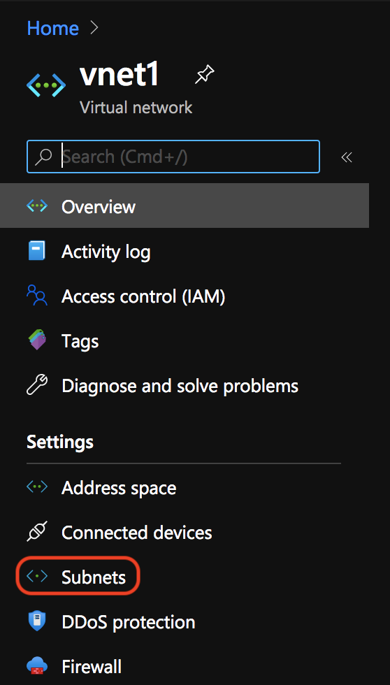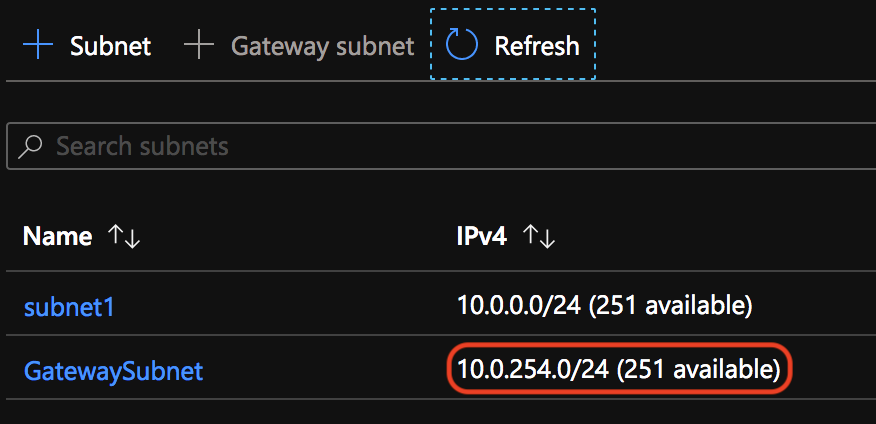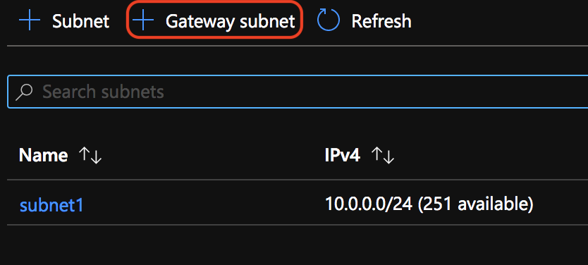 - Vaya a la opción “Subnet” de la pantalla de Virtual Network y presione “Gateway Subnet” para crearla.