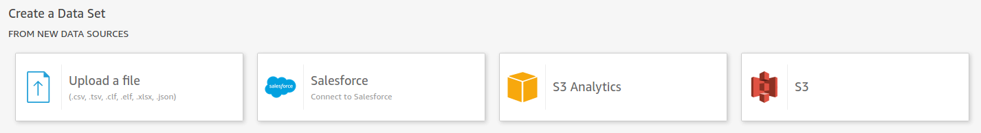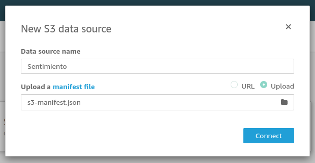 Regresando a QuickSight en la pantalla de creación de la fuente de datos crearemos tres fuentes de datos utilizando cada uno de los archivos generados anteriormente. Es necesario crear nuevas fuentes de datos de S3, a continuación veremos paso a paso como crear dicha fuente.