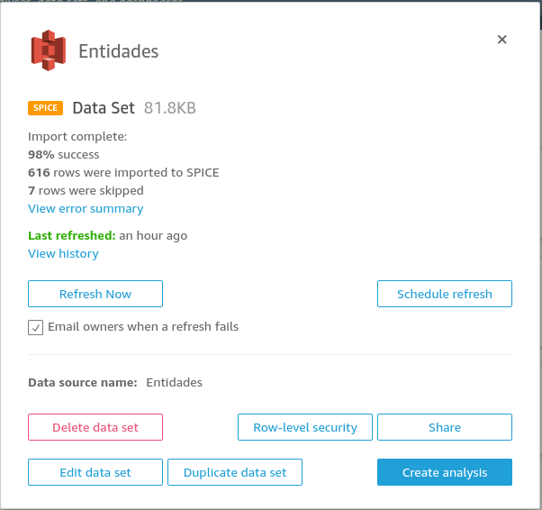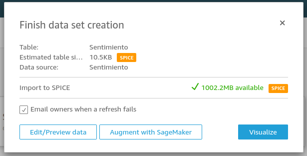 2. Si el archivo es correcto podremos ver la siguiente ventana de confirmación, si damos clic en Edit/Preview podemos ver los datos cargados a QuickSight.