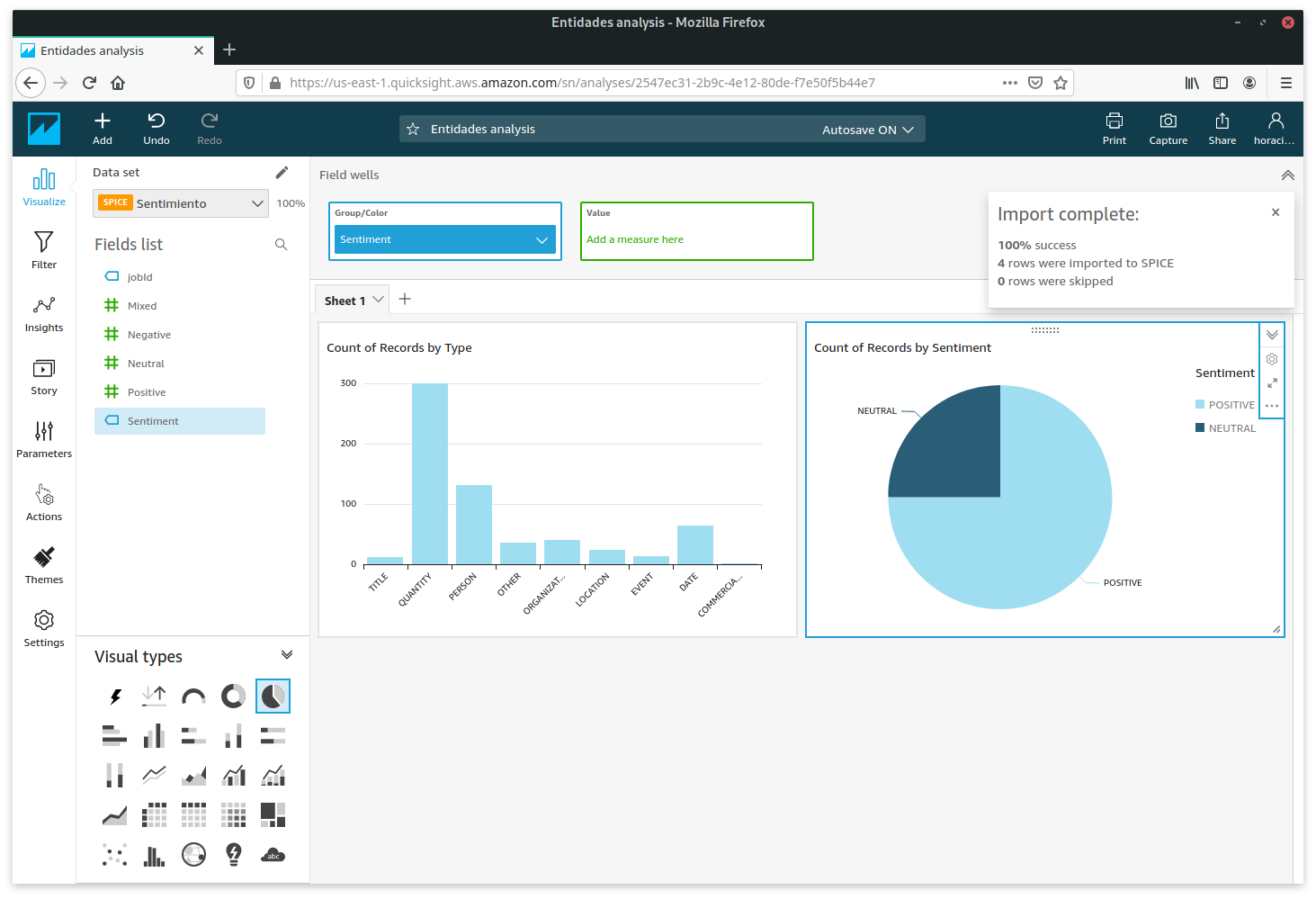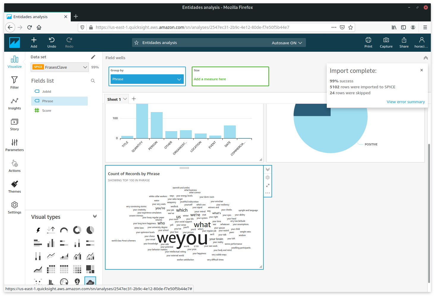 Ahora es necesario poder explotar la información obtenida desde Amazon QuickSight, para eso crearemos un dashboard sencillo en el cual podamos ver la tendencia del sentimiento en las conversaciones, frases clave mayormente utilizadas y entidades detectadas dentro de las conversaciones.