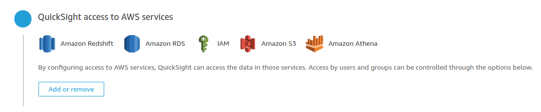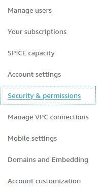 Primero es necesario verificar que QuickSight tiene permisos para leer el contenido del bucket de S3 con los resultados del análisis, dentro de QuickSight en la sección de Administrar QuickSight (Manage QuickSight) se encuentra la sección de Seguridad y Permisos (Security and Permissions) en el menu de administración, en esta sección se localizan los permisos a otros servicios de AWS (QuickSight access to AWS services).