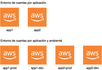 La siguiente imagen muestra ejemplos para ambientes de múltiples cuentas, en el primero, asignando una aplicación por cuenta AWS (app1, app2, etc.), mientras que en el segundo ejemplo observamos una segregación mayor con cuentas aisladas por aplicación y ambiente (app1-dev, app1-test, app1-prod, app2-dev, app2-test, app2-prod, etc.)