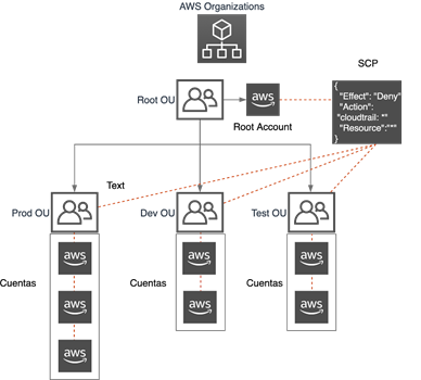 En la imagen siguiente es posible observar como AWS Organizations permite centralizar la administración del entorno de cuentas múltiples en una cuenta principal, con AWS Organizations es posible organizar cuentas en Unidades Organizacionales y establecer políticas de control de servicio (SCP) que aplican para todas las cuentas de la organización, lo que permite establecer una línea base de controles elementales sobre todas las cuentas.