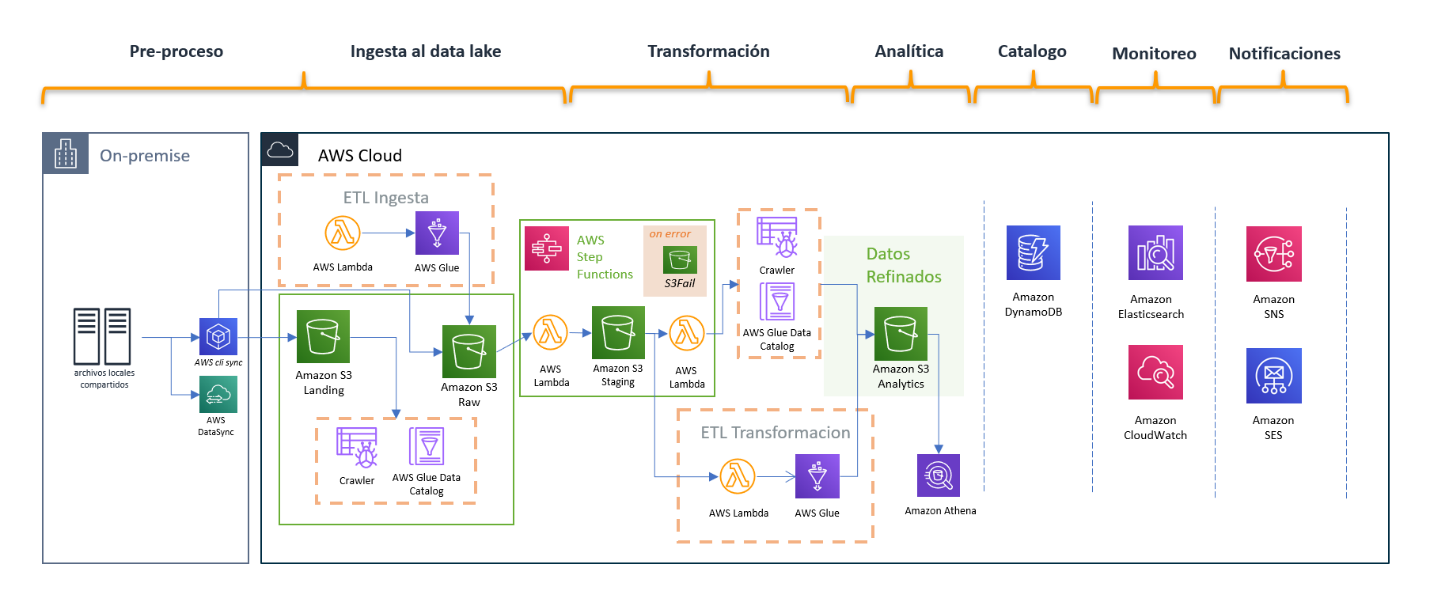 Un amplio catálogo de servicios de AWS permitió construir el Datalake, que por día recibe más de 100 fuentes de datos en archivos y cuenta con 200 TB de datos históricos de varios años. El Datalake presta servicios a diversas áreas del banco como Fraudes, Inteligencia de Negocio, Diseño Comercial y Operaciones. Algunos de los servicios de AWS utilizados fueron:
