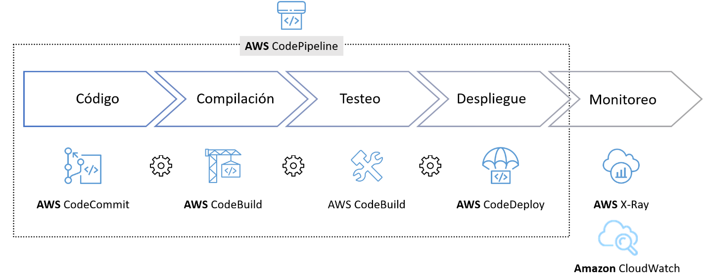 Con el objetivo de agilizar el proceso de desarrollo y despliegue de la aplicación se recurrió a la suite de servicios de DevOps de AWS: