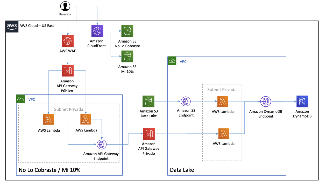 Para construir estas soluciones se necesitaron de varios componentes e integraciones, entre ellas: las fuentes de datos (disponibles en el Datalake Corporativo), aplicaciones webs, integraciones entre las aplicaciones y el Datalake, APIs de comunicación entre las aplicaciones webs y el backend en AWS Lambda, una base de datos no relacional (Amazon DynamoDB) como fuente de consulta con escalabilidad que puede soportar millones de solicitudes, servicios de CDN / Cache (Amazon Cloudfront) y la conectividad privada entre las distintas cuentas y servicios de AWS.