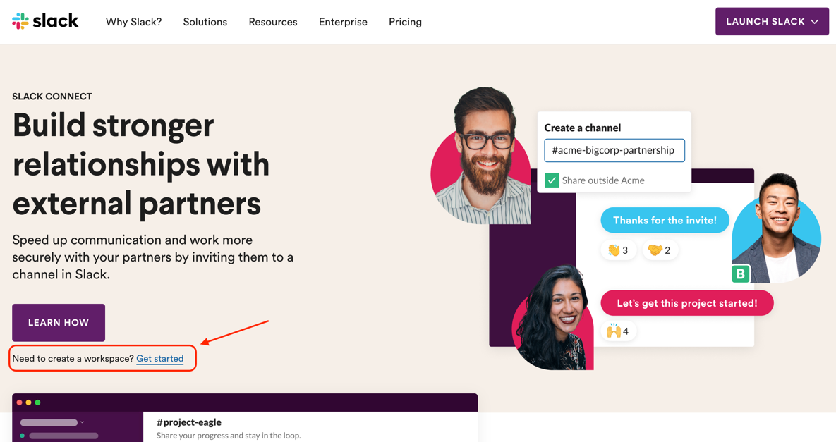 Acceda la página oficial de Slack (www.slack.com) y haga clic en «Empezar»