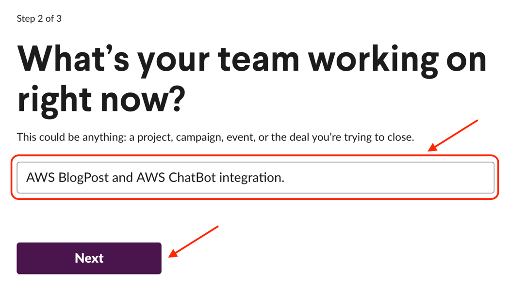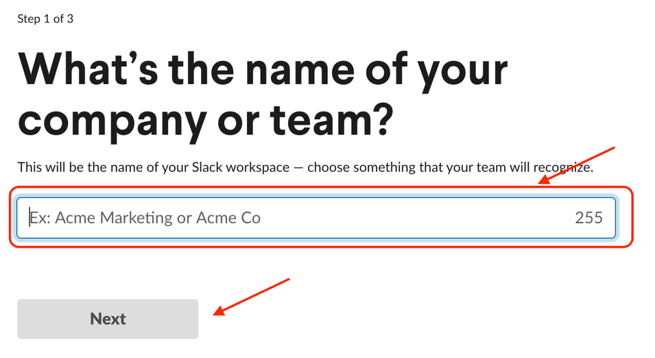 Solo se requieren 3 pasos más para crear el nuevo espacio de trabajo de Slack. Paso 1: Introduce «Nombre del equipo» y haz clic en «Siguiente».