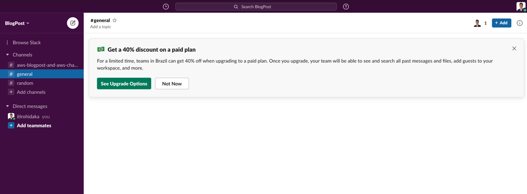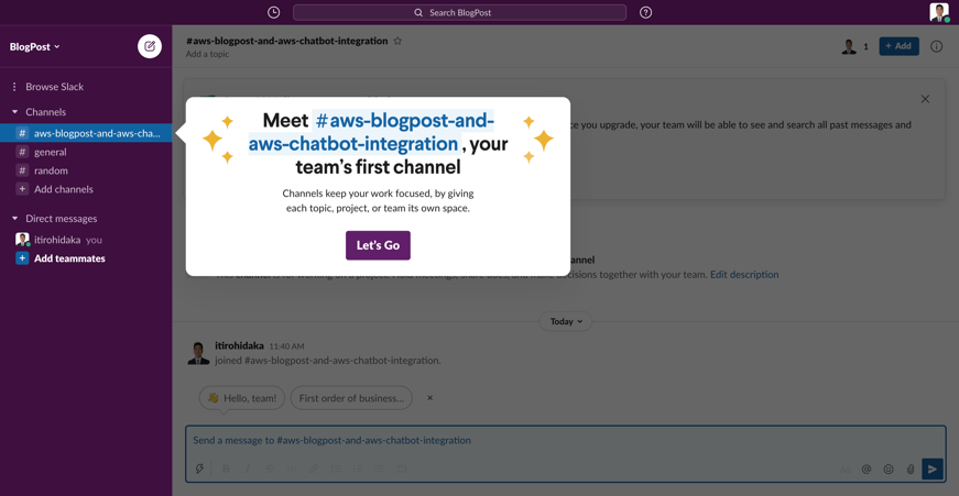 Introduzca el comando «@aws help» para realizar una primera prueba. Si recibe un mensaje solicitando la invitación para unirse a @aws, haga clic en «Sí».