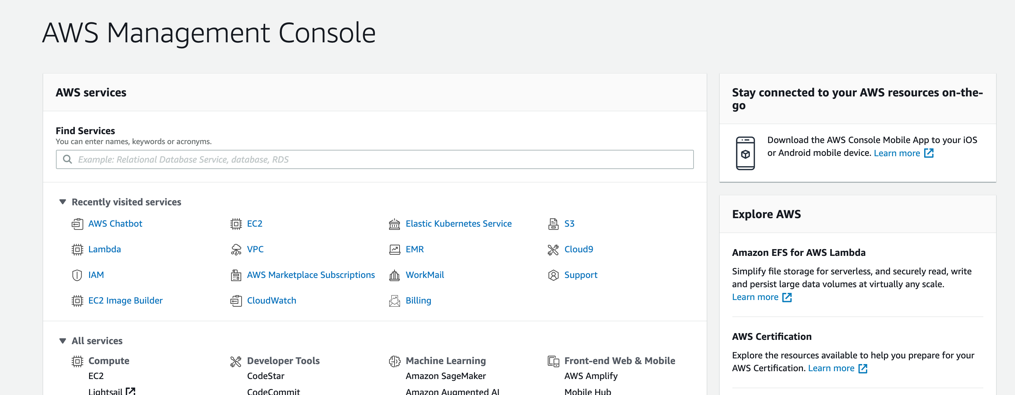Con el mismo navegador, abra una nueva pestaña e inicie sesión en la consola de AWS. Busque el servicio AWS Chatbot. Puede usar el menú «Servicios» en la esquina superior izquierda de la pantalla o usar el campo «Buscar servicios».