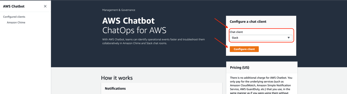 En la pantalla de inicio de AWS ChatBot, seleccione la opción «Slack» en el campo «Configurar el cliente de chat» y haga clic en el botón «Configurar cliente».