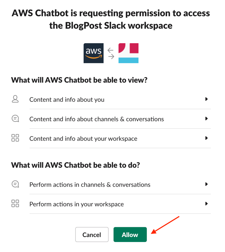 Recibirá un mensaje solicitando permiso para acceder al entorno de Slack a través de AWS ChatBot. Haga clic en «Permitir».