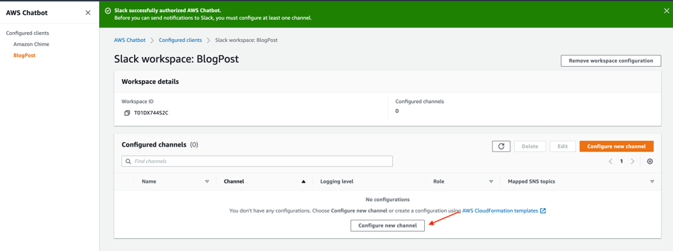 El siguiente paso será configurar el canal de Slack que enviará y recibirá los comandos de AWS. Haga clic en «Configurar un nuevo canal»
