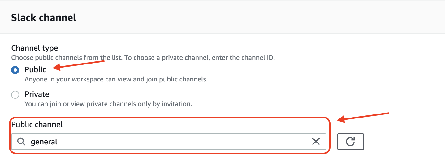 La próxima sesión es Slack Channel. Debe seleccionar el tipo de canal (Público o Privado) y seleccionar el canal en el siguiente campo.
