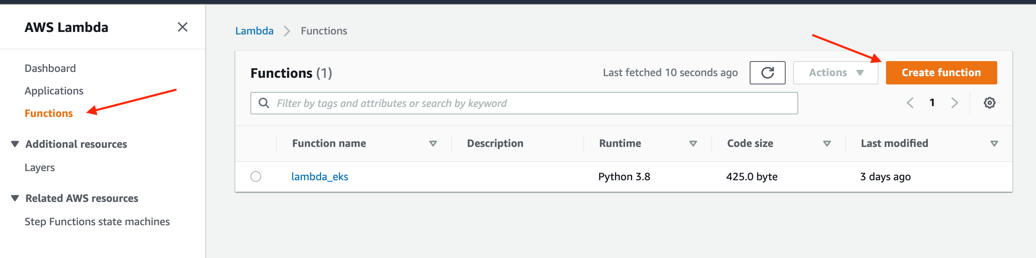 Para crear nuestra función Lambda, haga clic en «Servicios», «Lambda». Haga clic en el menú «Funciones» y el botón «Crear función».