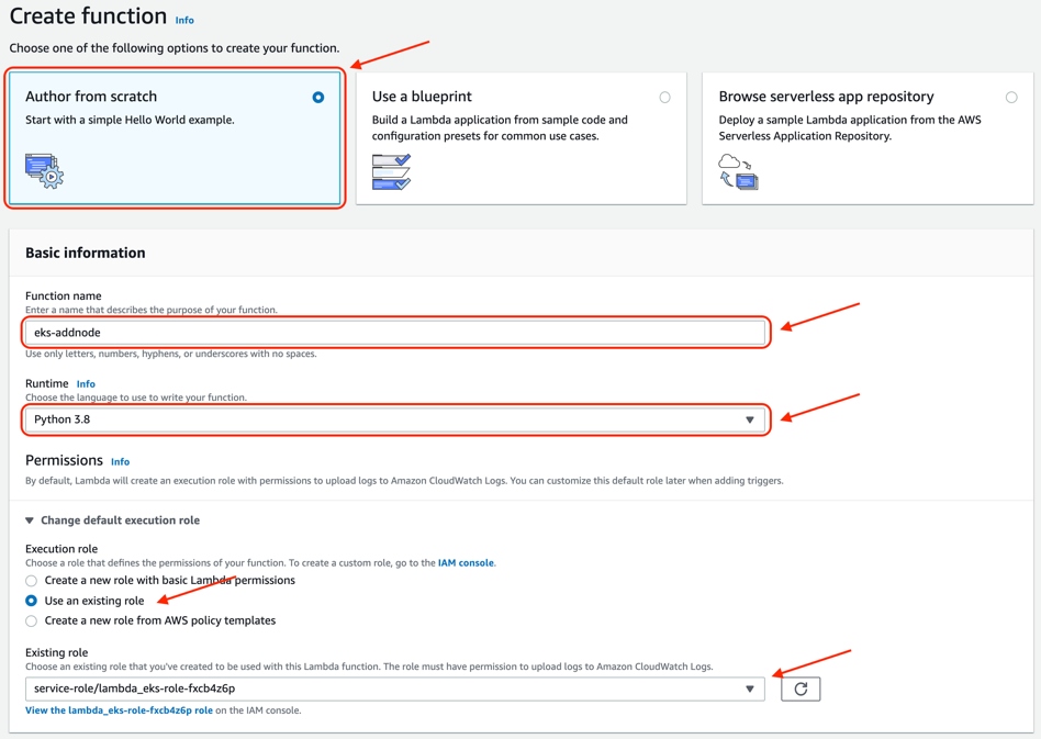 En la pantalla «Crear función», seleccione «Autor desde cero». Defina un nombre para la función utilizando el campo «Nombre de función». Hicimos la elección de desarrollar la función utilizando Python 3.8. Seleccione el tiempo de ejecución «Python 3.8». En «Rol de ejecución» seleccione «Usar un rol existente» y seleccione el rol en la secuencia. Si no tiene un rol con permiso para agregar nuevos nodos EKS, debe crearlo de antemano. Esto se aplica a otros servicios que desea aprovisionar en AWS a través de AWS Lambda. Haga clic en el botón «Crear función».