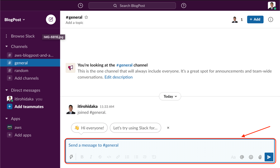 Ahora pasaremos a la fase final y realizaremos algunas pruebas. Vuelva a la aplicación Slack (puede utilizar el navegador o la aplicación. Uso del campo de mensaje.