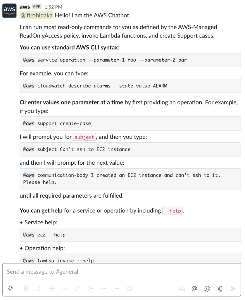 Si todo ha sido configurado correctamente, debería recibir una devolución como en el siguiente ejemplo. Tenga en cuenta los diferentes comandos posibles sugeridos por «@aws help». Si desea que AWS Lambda realice estos comandos, debe adaptar el código para atender esta necesidad, lo que significa que «@aws help» sugiere comandos, y si AWS Lambda no tiene en cuenta estos comandos en su código, este comando no se ejecutará:
