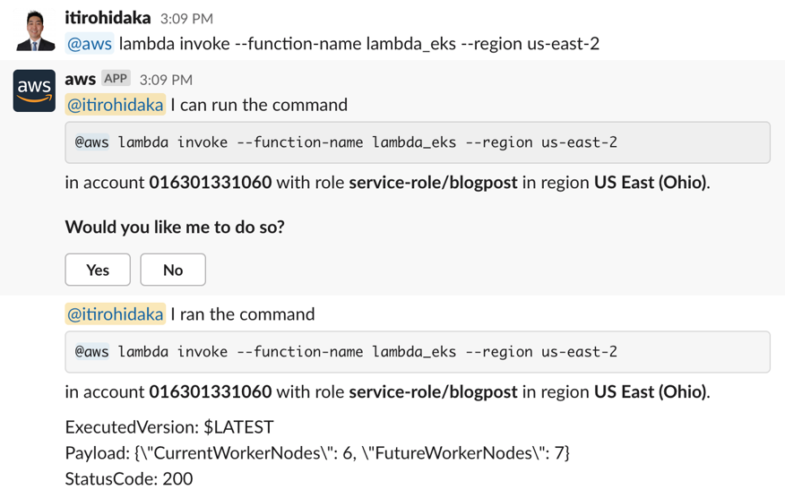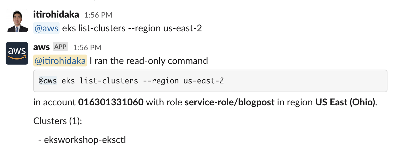 En el campo de mensaje de Slack, escribiremos un comando para enumerar los clústeres de Amazon EKS en la región us-east-2. Escriba la siguiente cadena en el campo de mensaje (sin las comillas dobles): «@aws eks list-clusters – -region us-east-2″