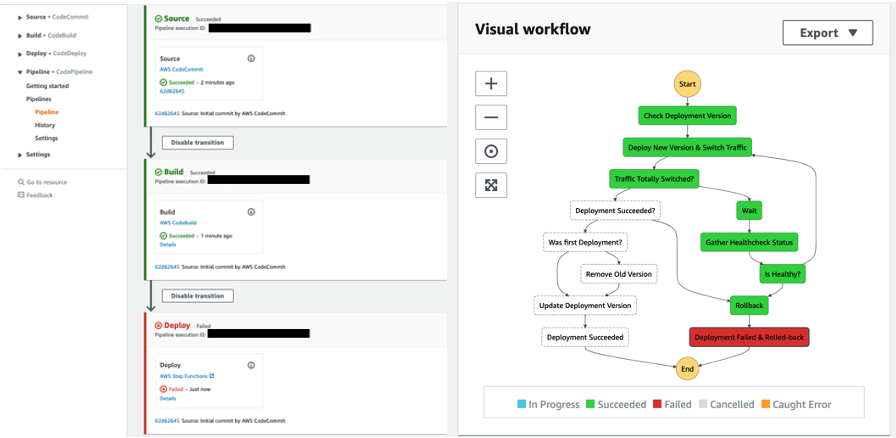 Espere unos minutos y verá en el flujo visual que se activó una reversión porque la nueva versión no pasó la comprobación de estado. Es importante tener en cuenta que la comprobación de estado es una función de AWS Lambda que se puede personalizar si es necesario.