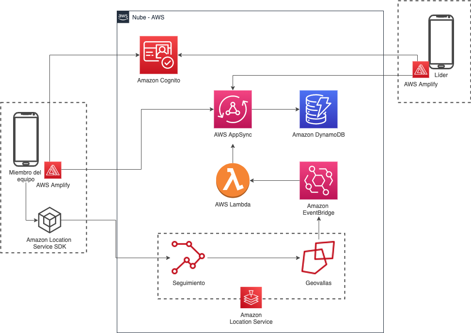 [TEXTO ALT: La aplicación móvil del miembro del equipo se conecta al rastreador de Amazon Location Service a través del SDK, y cuando la latitud y longitud proporcionadas por el rastreador cruzan una geovalla, se envía un evento a EventBridge y se activa una función Lambda. Esta función actualiza DynamoDB a través de AppSync con información del usuario, marcándolo como seguro o no. Otra aplicación, utilizada por los líderes de equipo, rastrea a los usuarios y su estado. Ambas aplicaciones móviles dependen de Cognito para su autenticación y autorización. La aplicación móvil utiliza AWS Amplify para conectarse a Cognito, a través de Amplify Auth y AppSync, a través de Amplify API y Amplify DataStore.]