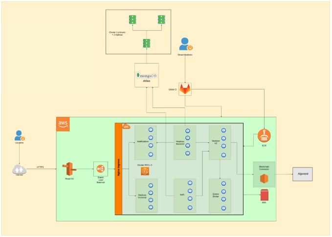 En AWS, la solución está implementada con Route53, Elastic Load Balancer (NGINX Ingress) 3 clusters EKS que gestionan notificaciones, autorización, la funcionalidad de firma, autorización y colas, además de un cluster de MongoDB Atlas para la data. La conexión con el blockchain de Algorand se gestiona en el back end y EBS para almacenamiento.