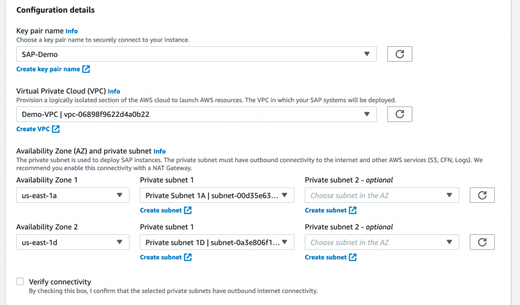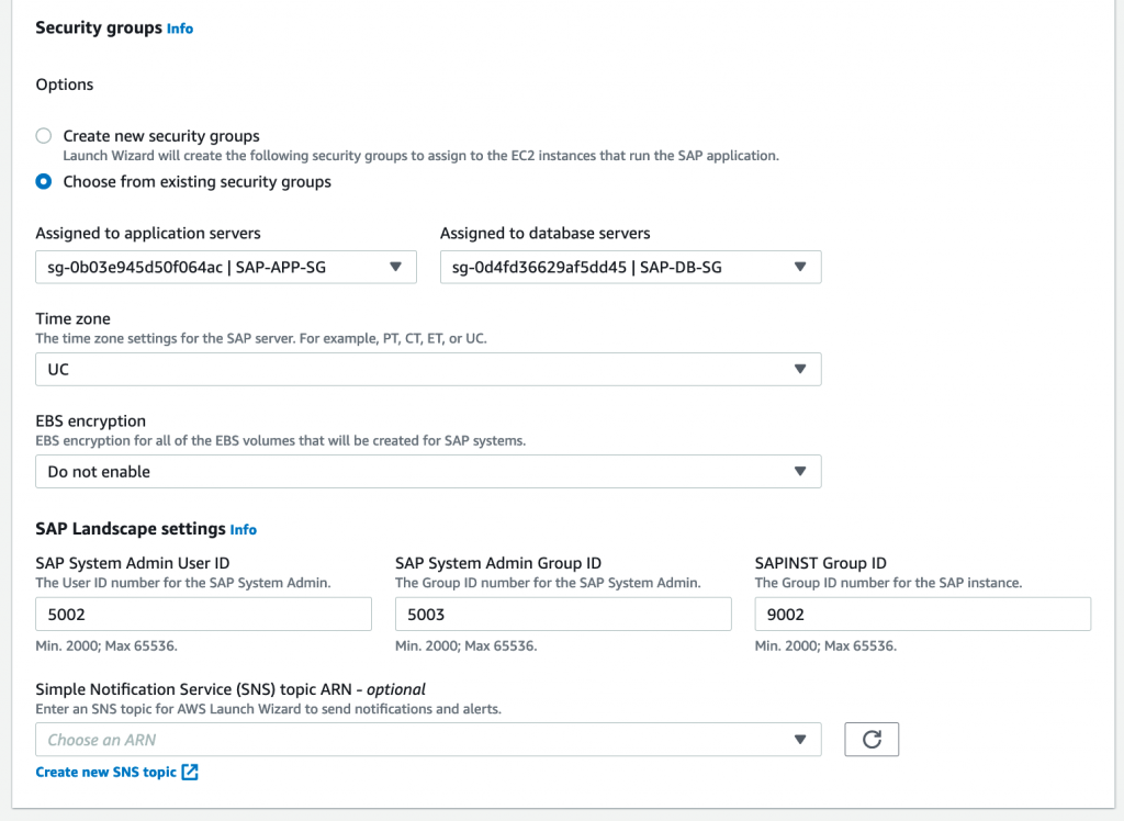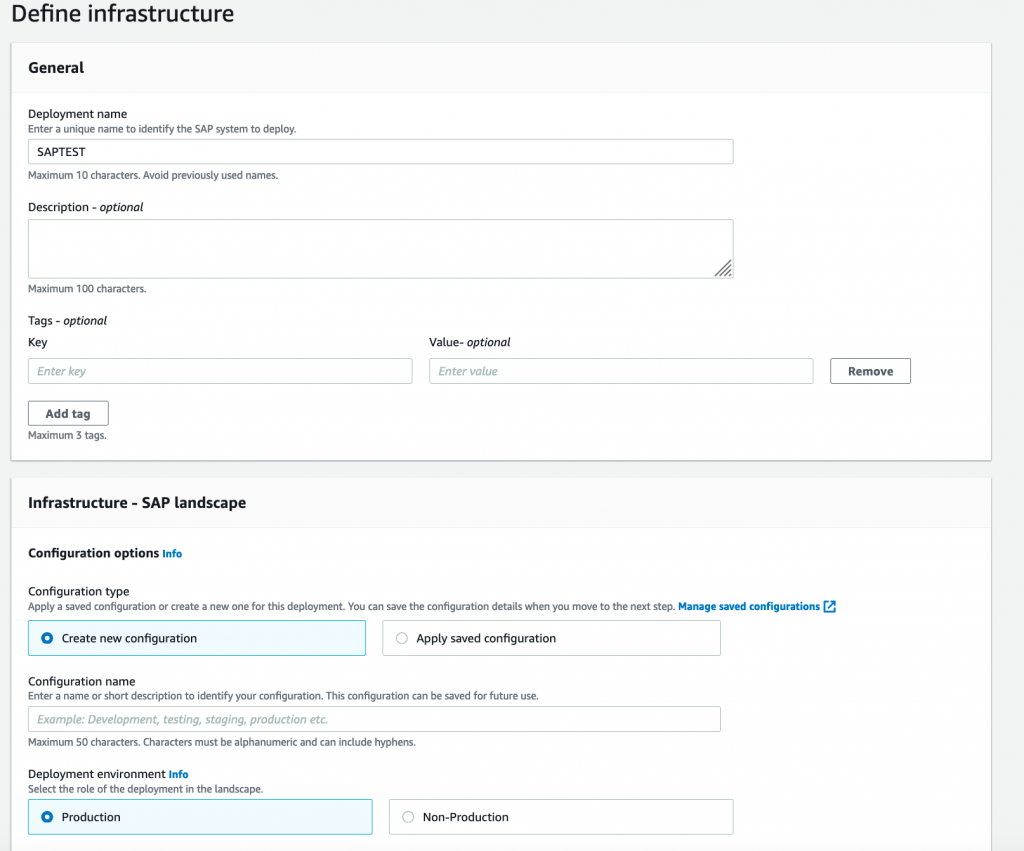 El paso 3 es la definición de la configuración de infraestructura, donde se decidirá la VPC donde será desplegada, incluyendo las zonas de disponibilidad para proveer redundancia en caso necesario. Adicionalmente serán creados (o seleccionados si ya existen) los Security Groups tanto para los Servidores de Aplicación como para la Base de Datos y los valores de configuración del Landscape de SAP.