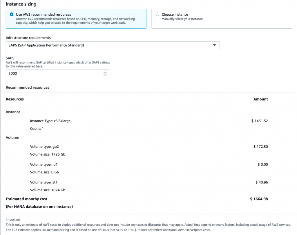 AWS Launch Wizard es capaz de realizar este dimensionamiento de forma automática, con los datos de los SAPs o en su defecto memoria y CPU, eligiendo las instancias mas adecuadas y ofreciendo además una estimación de su costo mensual.