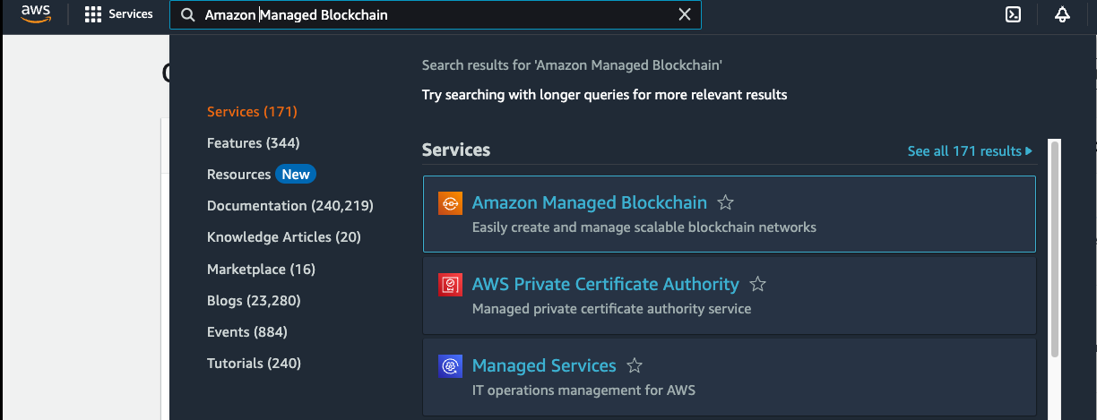 - En la consola de Amazon Web Services en el panel de búsqueda escribimos Amazon Managed Blockchain.