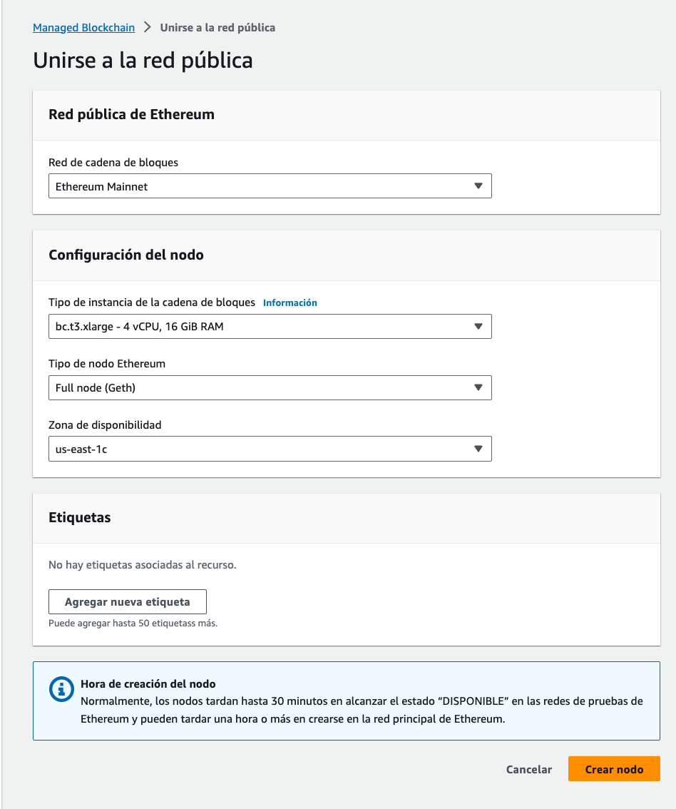 Hoy, haciendo uso de Amazon Managed Blockchain, que es un servicio totalmente administrado que facilita la adhesión a redes públicas o la creación y administración de redes privadas escalables mediante el uso de los marcos populares de código abierto como Hyperledger Fabric y Ethereum. Podemos interactuar con la Mainnet de Ethereum aprovechando las características brindadas por el servicio de Amazon Managed Blockchain, con el cual desplegaremos un nodo que nos permita interactuar con esta red.