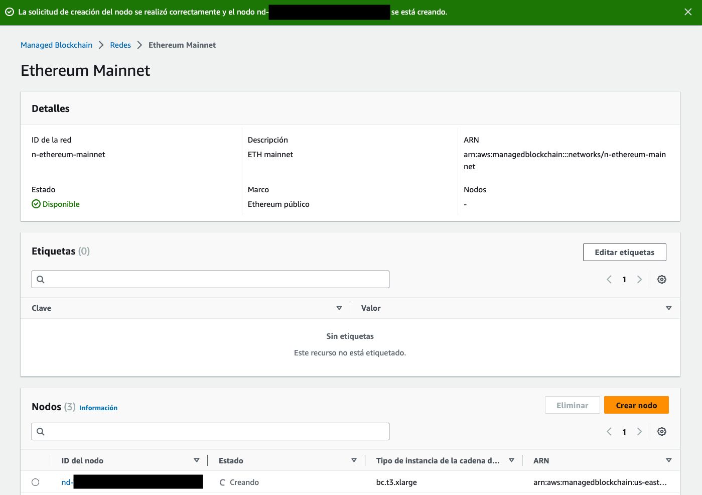 Veremos el nodo que se ha iniciado, y se verá el estado en Creando, qué luego de aproximadamente 30 minutos pasará a Disponible.
