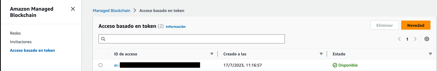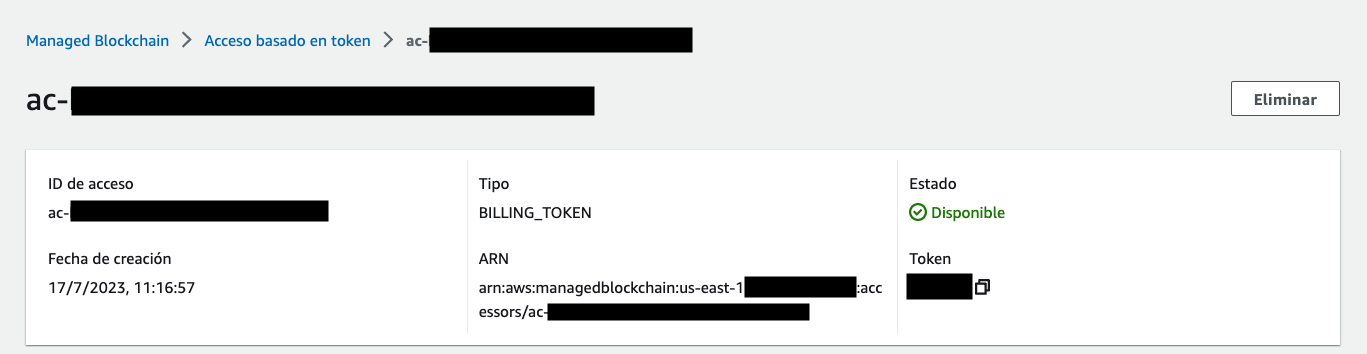En la consola de AWS navegamos hasta el servicio de Amazon Managed Blockchain y buscamos acceso basado en token, seleccionamos el previamente creado y le damos clic en eliminar. Luego en redes, ingresamos a redes públicas, y procedemos a eliminar el nodo creado en red de Ethereum.
