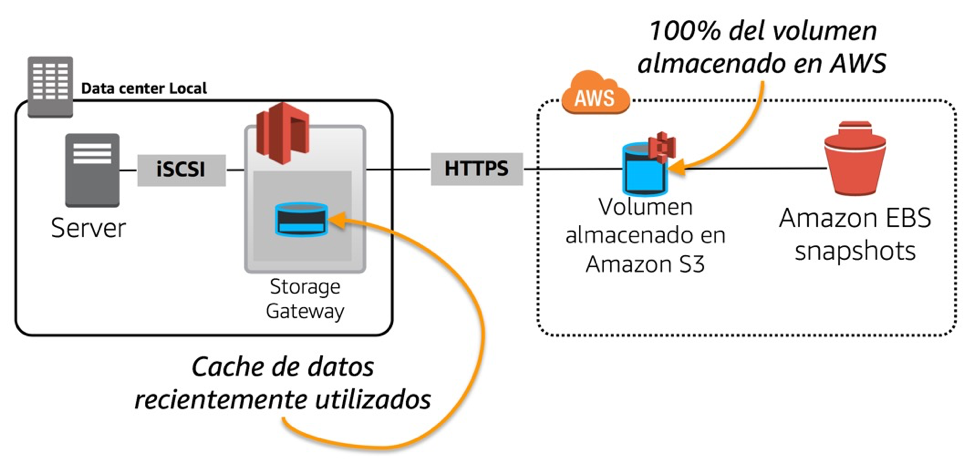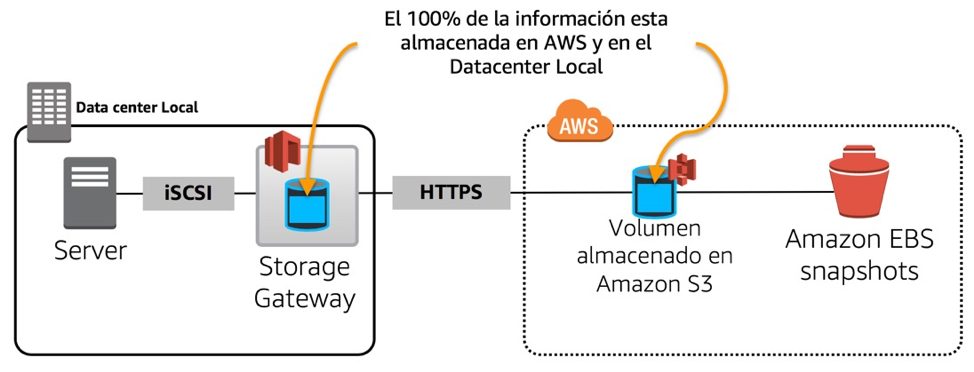 Volume Gateway Stored Mode opera de la misma forma que el Volume Gateway Cache Mode pero la diferencia fundamental es que almacena una copia completa de la información en forma local mientras mantiene una copia en S3 en forma de snapshots EBS.