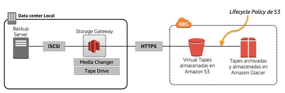 La información que se guarda en estas cintas virtuales se envía a S3 en forma asincrónica y esta misma información, mediante políticas de envejecimiento de S3, pueden ser migradas a Glacier.