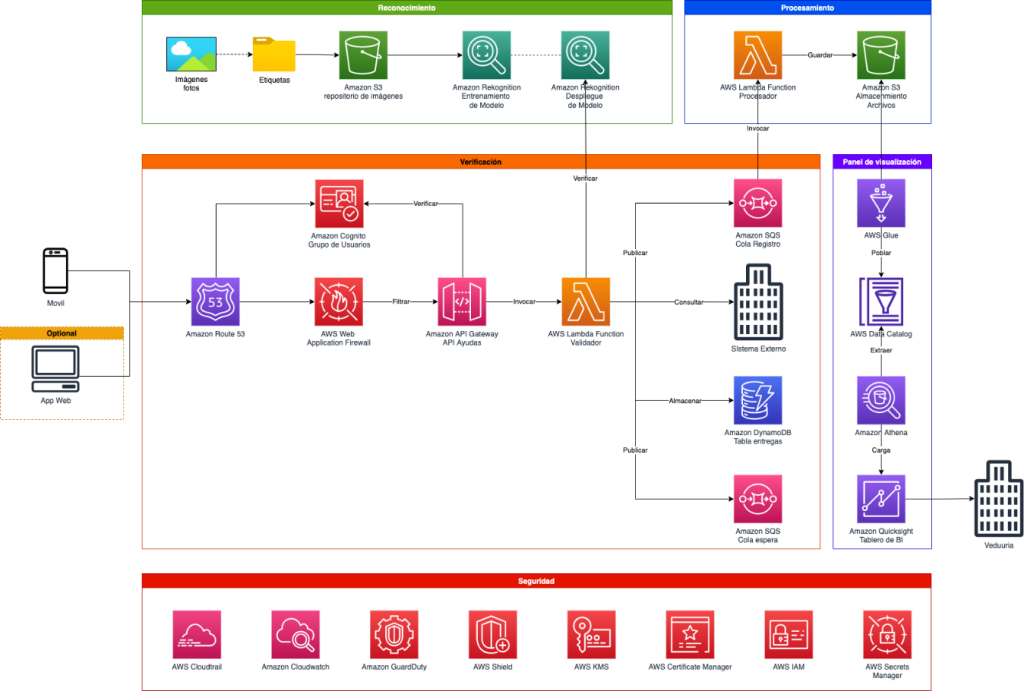 - Amazon Simple Queue Service (SQS) (Cola de registro): Almacenamiento de mensajes con información del proceso de reconocimiento de productos y datos demográficos relacionados con los beneficiarios para su procesamiento posterior.