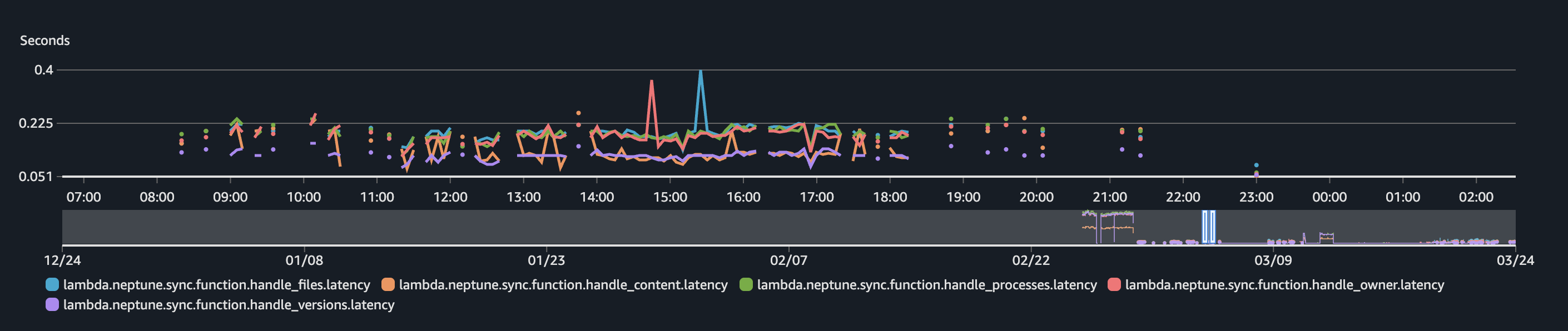 Cuando Neptune escaló inicialmente, se estimó que se necesitarían 3 máquinas db.r5.2xlarge para la afluencia inicial. A medida que la ingesta de datos en la cuenta aumentó (4 millones por día), se recuperaron algunas métricas de tiempo de inserción de Amazon CloudWatch y se descubrió que el tiempo de inserción con un volumen alto había aumentado drásticamente en comparación con cuando el número de inserciones era bajo.