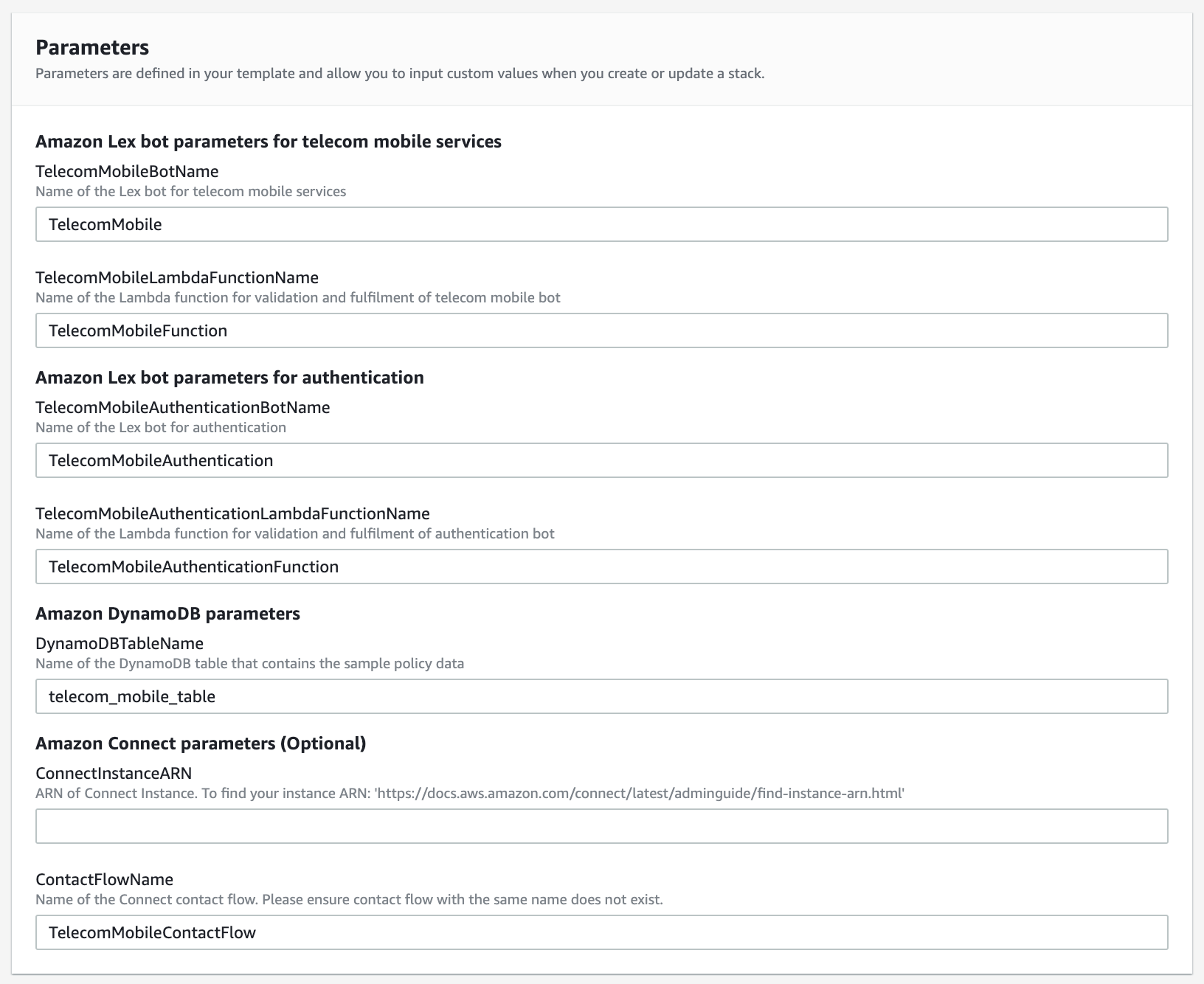 - En la sección Parameters, ingrese los nombres de los recursos que se crearán: los bots de Amazon Lex (uno para autenticación y otro para la operación), la tabla de DynamoDB y el flujo de contacto de Amazon Connect. Si cuenta con una instancia de Amazon Connect existente activa, indique el ARN de la instancia de forma opcional.