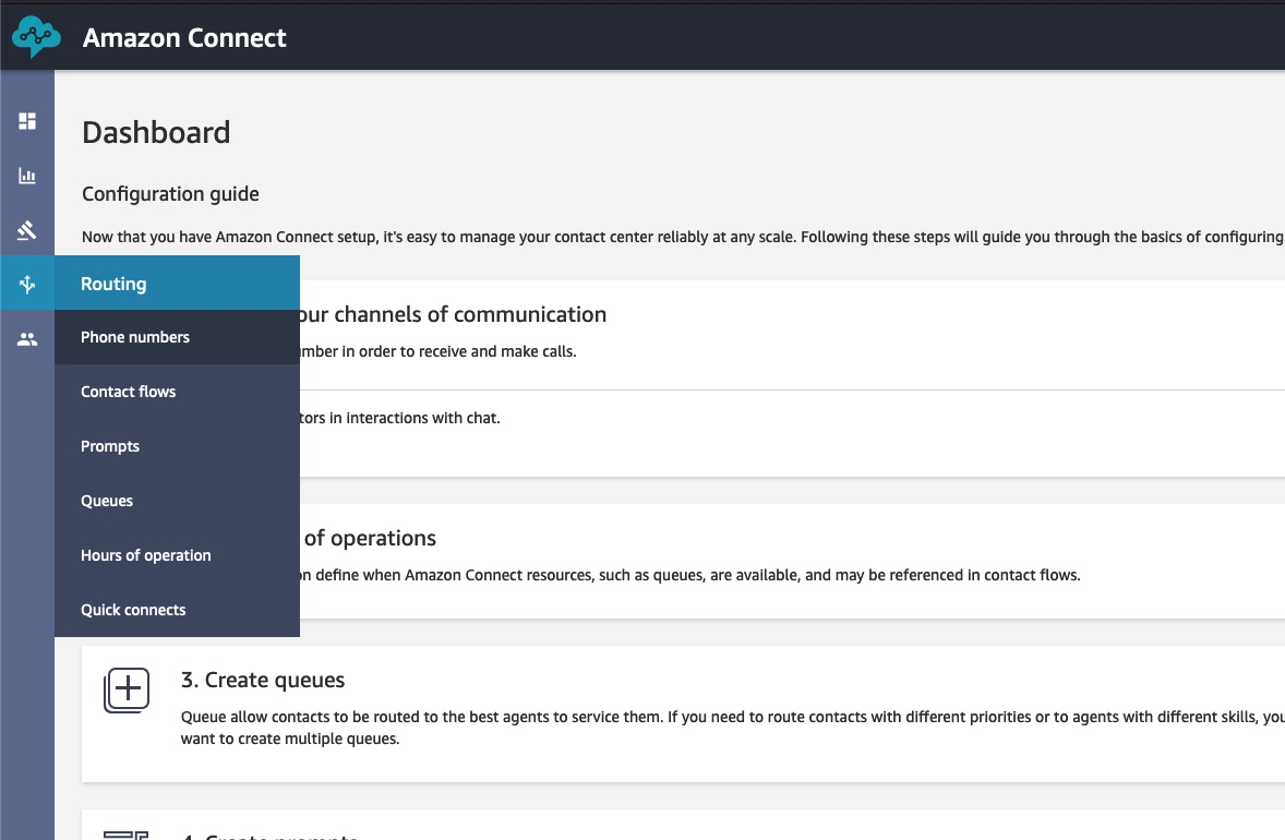 - Si proporcionó un ARN de instancia Amazon Connect durante la creación del Stack, abra el panel de Amazon Connect y elija Números de teléfono (Phone Numbers) en el menú Enrutamiento (Routing) en el panel de navegación.