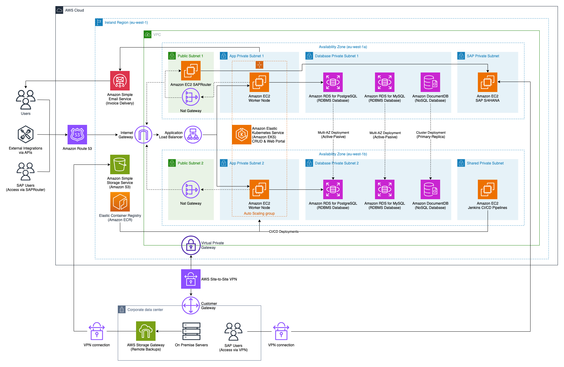 Este fue nuestro despliegue más sencillo, ya que prácticamente fue un lift & shift de los entornos que teníamos on-premise, aprovechando para actualizar tanto versiones de sistemas operativos como la propia versión de SAP. También se configuro una instancia con el componente SAPRouter en una subnet publica y con sus puertos limitados vía el uso de Security Groups, el cual permite el acceso al equipo de soporte de SAP, y a su vez a nuestro propio equipo desde internet. No ha sido el más difícil, pero sí el más urgente, ya que vino precedido por la avería de uno de los servidores físicos que daban servicio a SAP y cuya reparación hubiera sido muy costosa y sin demasiadas garantías dada la antigüedad de los equipos. Con el despliegue en AWS nos hemos ahorrado esos costes de reparación y soporte de hardware, reducido la factura de nuestro housing y también ahorrado en costes indirectos de personal y sus traslados al CPD.