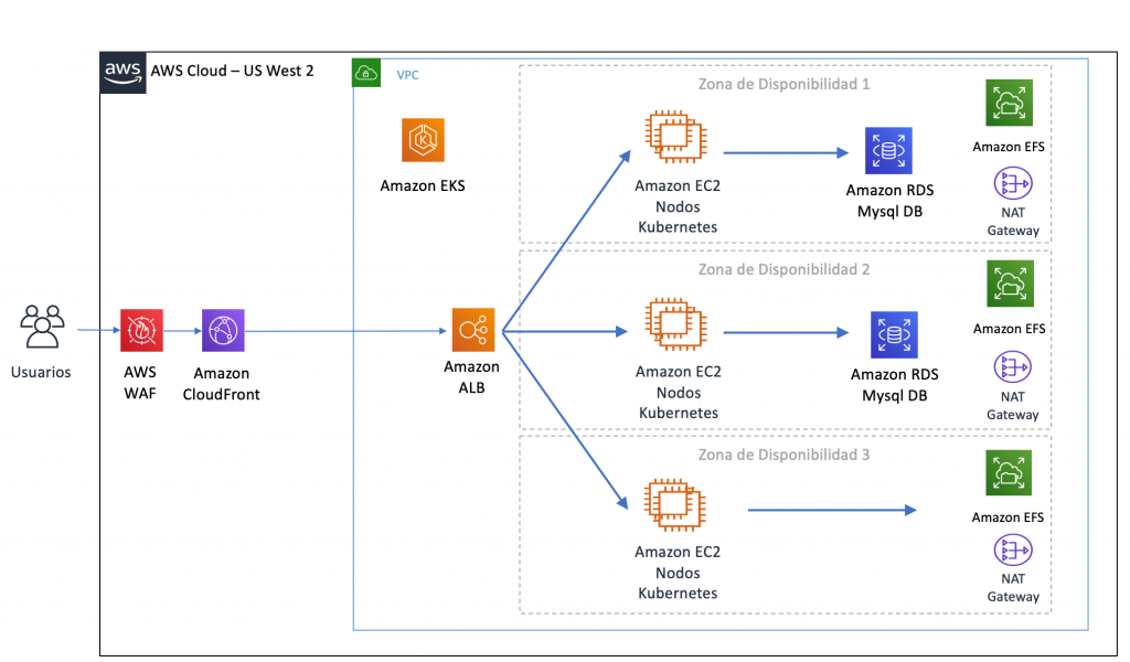 El primer paso fue disponibilizar el aplicativo en contenedores utilizando Amazon Elastic Kubernetes Service (EKS) un servicio basado en Kubernetes completamente administrado, altamente disponible, seguro y escalable.