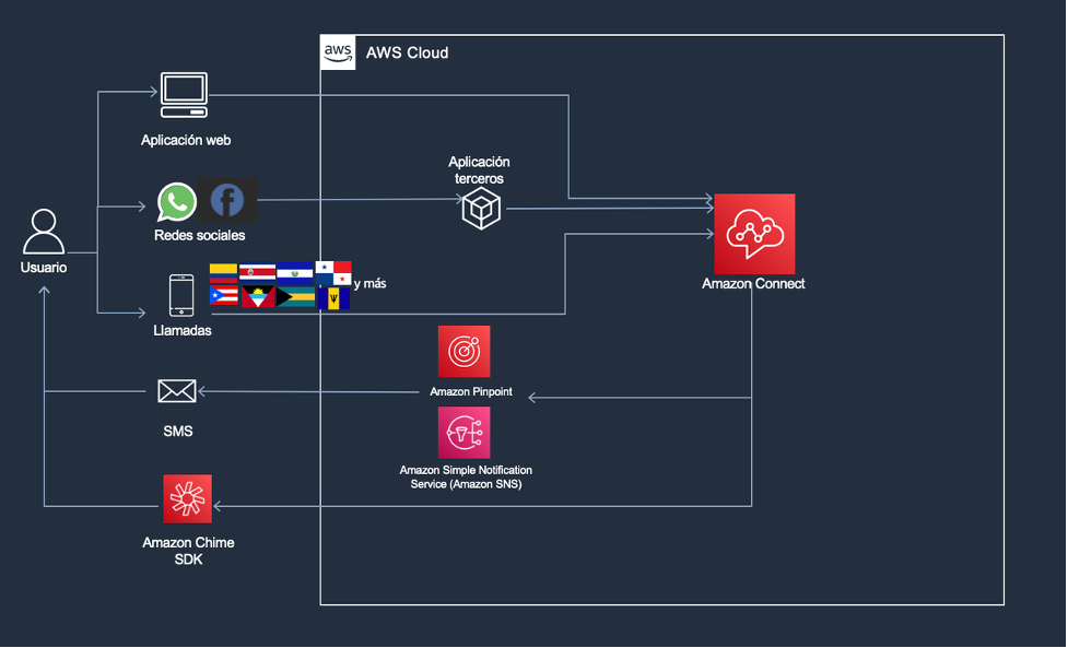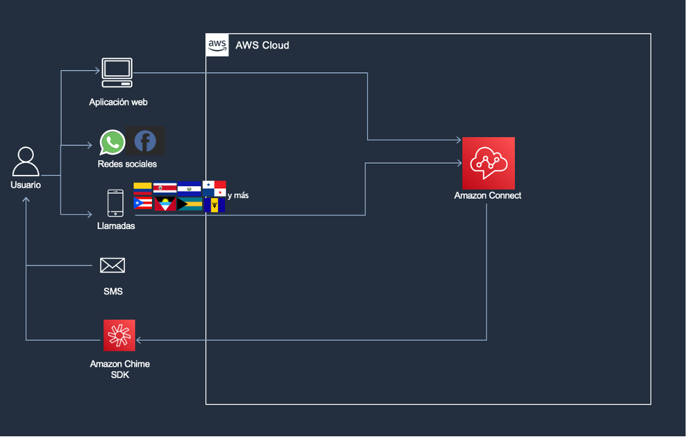 Tras la integración de todos los canales al ecosistema creado alrededor de Amazon Connect, el objetivo es manejar de forma eficiente y controlada las peticiones que se reciben, buscando un tiempo de respuesta óptimo con el fin de disminuir el tiempo de uso de cada canal y, consecuentemente, su congestión.