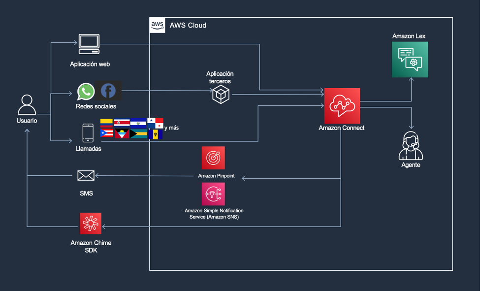 Por otro lado, los canales de redes sociales, y mensajes SMS no son soportados de forma nativa. Como solución a esto, se pueden integrar aplicaciones de terceros y otros servicios de AWS para permitir su acoplamiento al ecosistema. Por ende, el canal de redes sociales se puede habilitar a través de aplicaciones de terceros y el canal de SMS se puede integrar con el uso de servicios de mensajería y comunicación propios de AWS, como Amazon SNS y Amazon Pinpoint.
